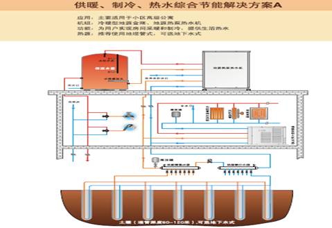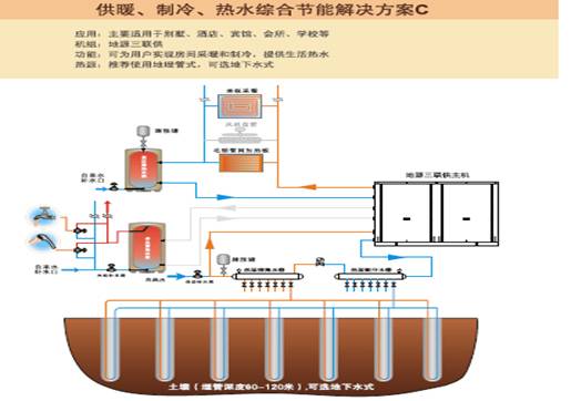 2、地源金剛機(jī)組提供制冷和制暖,地源熱泵熱水機(jī)機(jī)組提供生活熱水