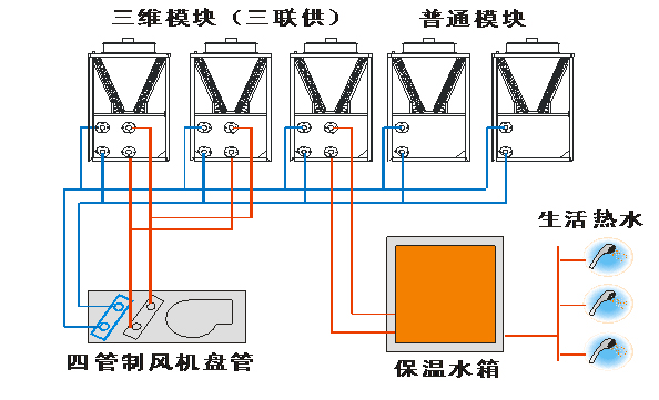 1、 夏天制冷,冬天制熱,及全年生活熱水